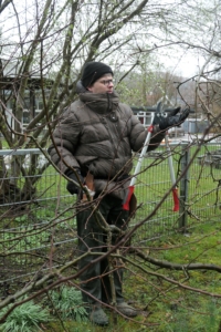 So gegen 11 Uhr war der Theorieteil beendet und es ging raus in den Regen. Der Rückschnitt der Spalierbäumchen am Vereinsheim war allerdings eine wirklich nasse Angelegenheit. Trotz guter Regenklamotten waren alle froh, als es Mittag wurde und man sich im Vereinsheim wieder aufwärmen konnte. Hier wurde dann auch zügig das Essen serviert. Elke, Kathrin und Beate hatten deftige Schlachtplatte vorbereitet, die bei den Teilnehmern sehr gut ankam. Zum Abschluss gab es noch Kaffee und süße Schmankerl.