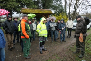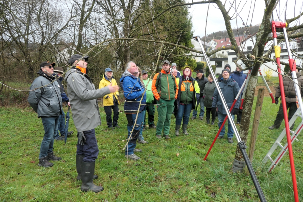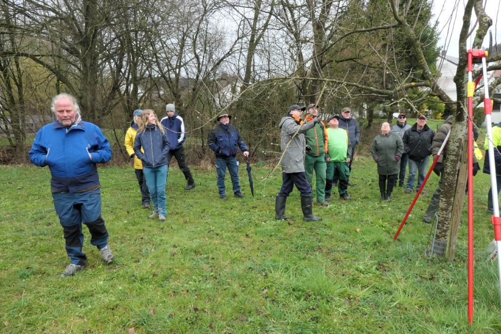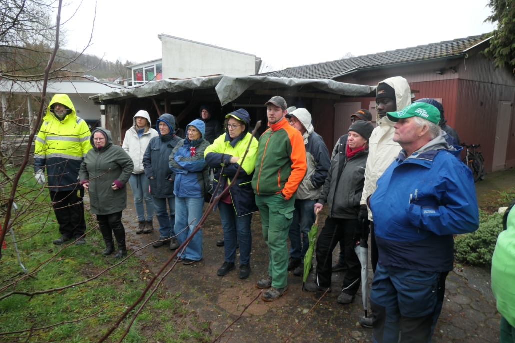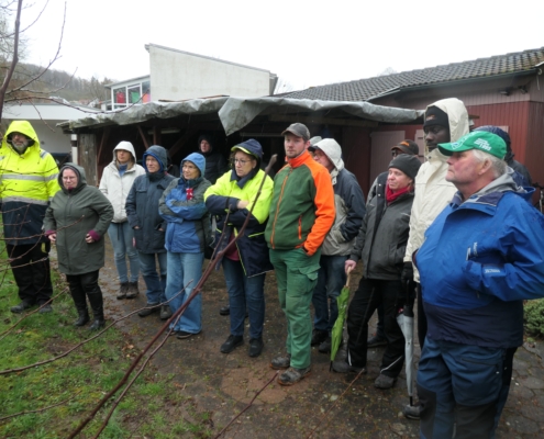 Am Samstag, 14. März fand unser ganztägiger Frühjahrsschnittkurs statt. Trotz strömendem Regen hatten sich rund 25 Personen um 9 Uhr am Parkplatz des TSV-Heims eingefunden. Die Teilnehmer wurden von Vorstand Karl Wurst begrüßt und anschließend machte sich die Gruppe unverzüglich auf den Weg zu unserem Vereinsheim. Dort gab Obstbauberater Adrian Klose zunächst eine eineinhalbstündige, theoretische Einführung in die Grundlagen des Obstbaumschnitts.