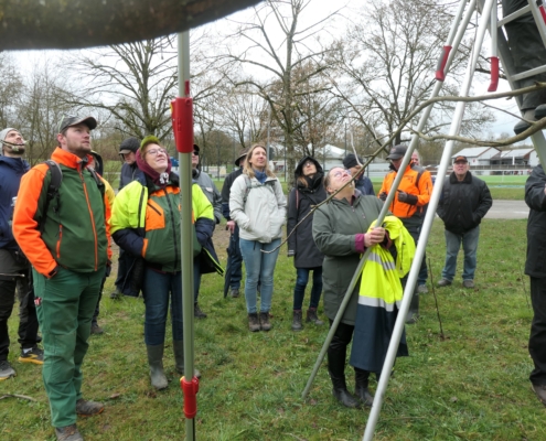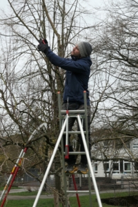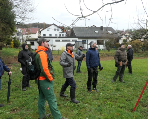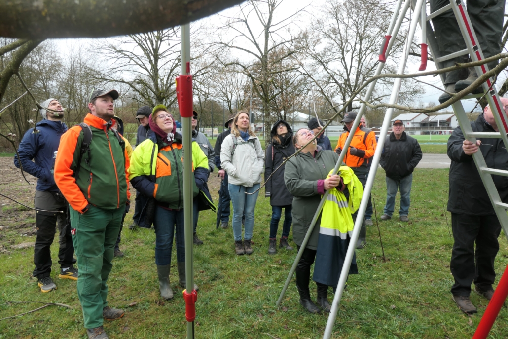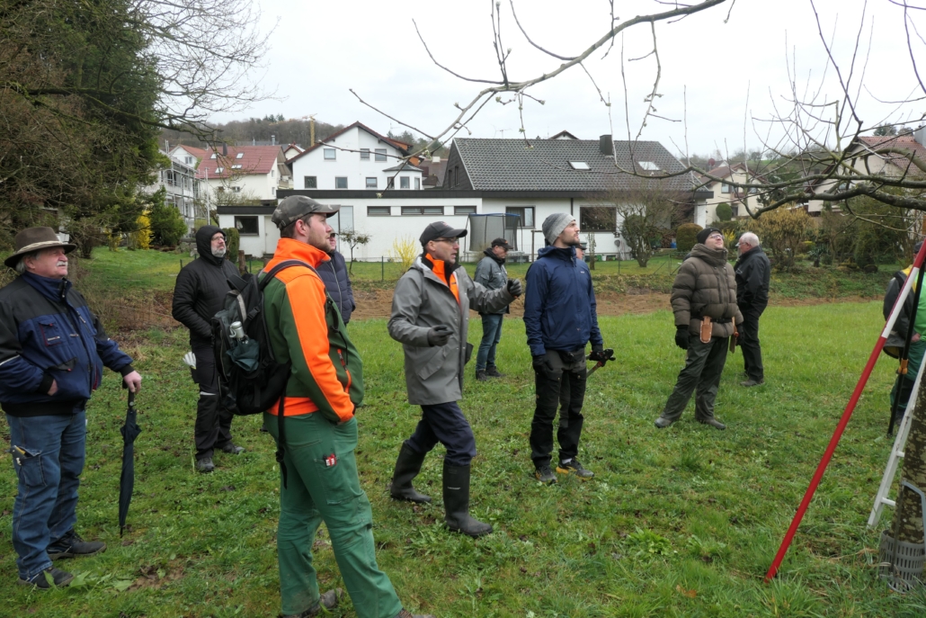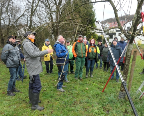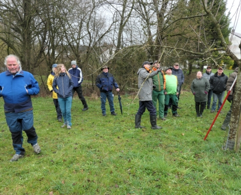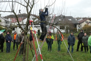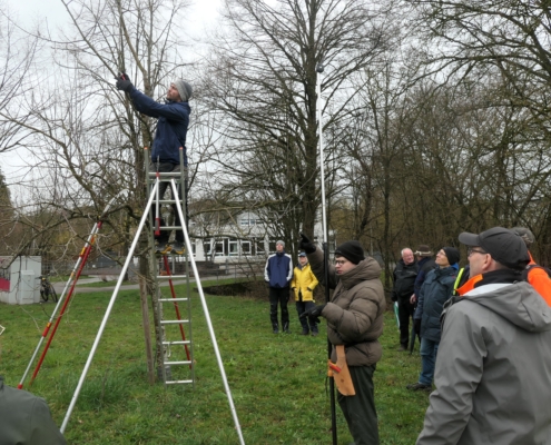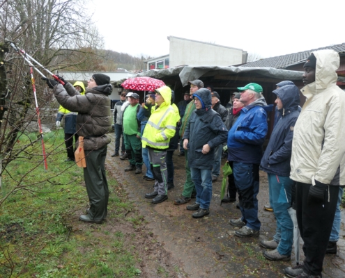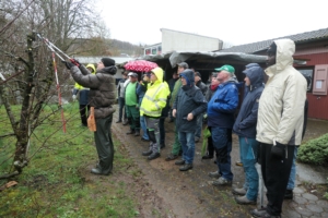 Während der Mittagspause hatte es dann endlich aufgehört zu regnen. Die Gruppe machte sich auf den Weg zu dem „Jakob-Fischer“-Hochstamm, den wir 2016 unweit unseres Vereinsheims gepflanzt hatten. Hier ermunterte Obstbauberater Klose die Teilnehmer sich einzubringen und tatsächlich fanden sich ein paar Mutige, die mit Säge und Astschere aktiv wurden. So wurde der „Jakob-Fischer“ in reger Diskussion aller Beteiligten wieder in Form gebracht.