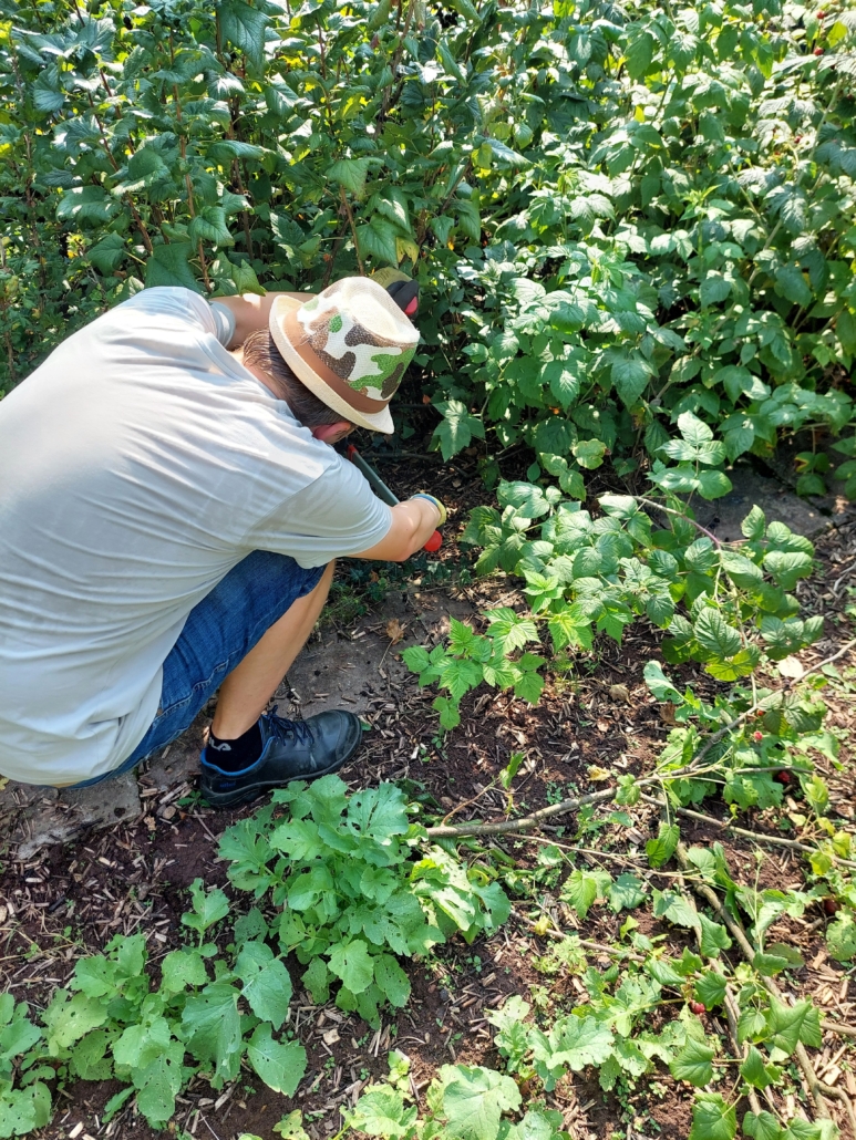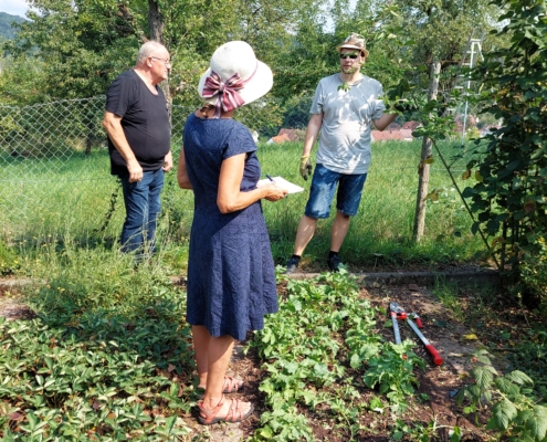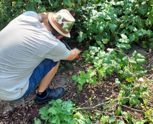 Dort wurde Obstbauberater Klose vom Landwirtschaftsamt zunächst den Schnitt unterschiedlicher Beerensträucher gezeigt. Er erläuterte den unterschiedlichen Schnitt von Sommer- und Herbsthimbeeren. Bei Ersteren wachsen die Ruten im ersten Jahr und tragen erst im zweiten Jahr Früchte. Nach der Ernte werden die abgetragenen, zweijährigen Ruten zurückgeschnitten. Herbsthimbeeren dagegen tragen bereits an den einjährigen Ruten und diese werden nach der Ernte vollständig zurückgeschnitten. Auch beim Schnitt von Johannisbeeren waren die Teilnehmer mit großer Aufmerksamkeit dabei.