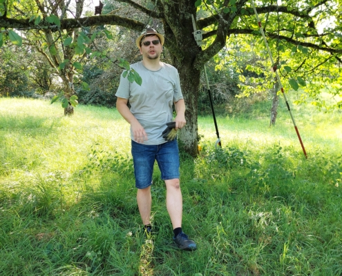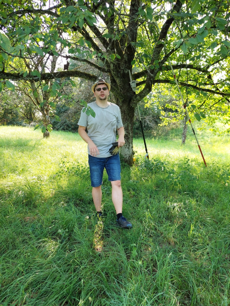 Leider waren dieses Jahr nur knapp zehn Interessenten zu unserem alljährlichen Sommerschnittkurs am Parkplatz des TSV-Vereinsheims erschienen. Vorstand Karl Wurst begrüßte die Teilnehmer herzlich und anschließend ging es unverzüglich auf das Grundstück eines OGV-Mitglieds, das nicht allzu weit vom Treffpunkt entfernt war.